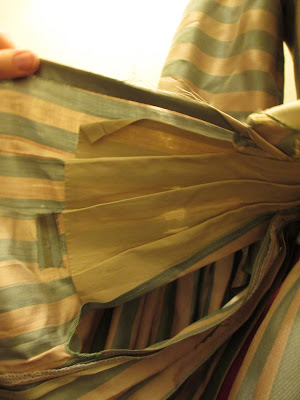 I plan to remove the entire front side panels and replace them with pieces of the petticoat. I love the idea of a matching petticoat, but I'm willing to sacrifice it to make the rest of this gown work. I'm also working on a sheer striped petticoat which I think will coordinate nicely with this gown worn a la polonaise.